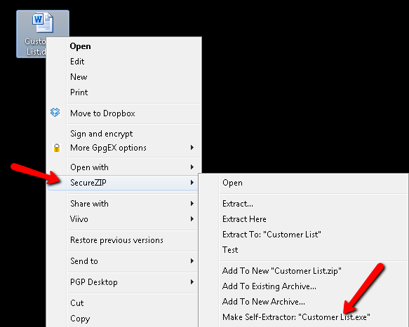 - Right click on the file you wish to work with, select PKZIP/SecureZIP and the create self extractor option