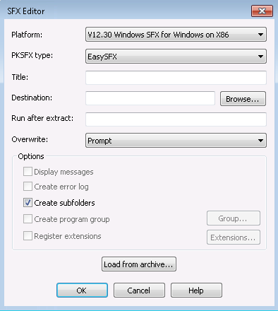 - From the SFX (self extractor) Editor, edit any options you wish to include.