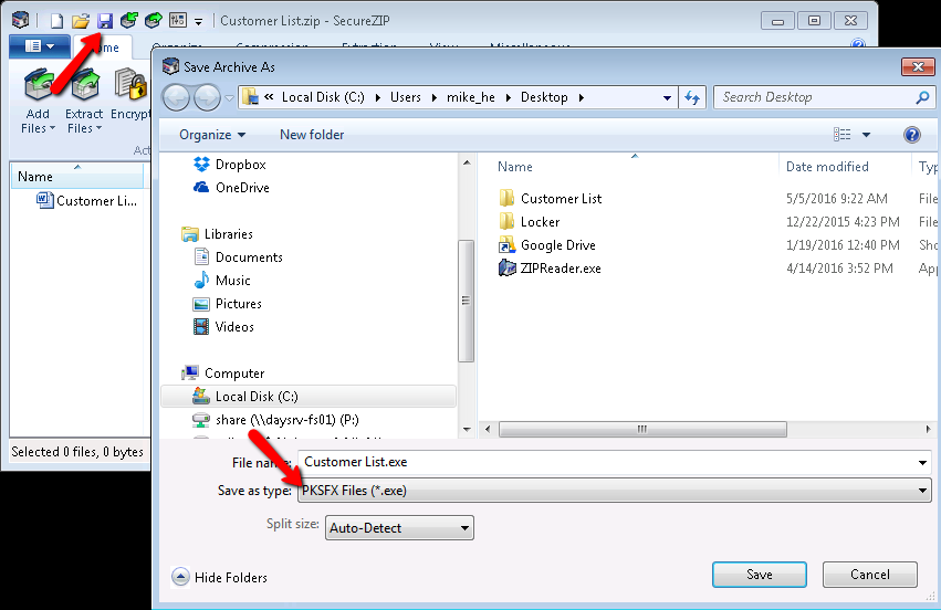 - Open the zip file you wish to create a self extractor from, Click on the save icon and in the Save type, select PKSFX