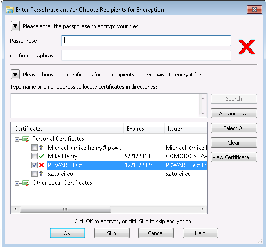 - Enter a passphrase or select a certificate to encrypt or click skip for no encryption