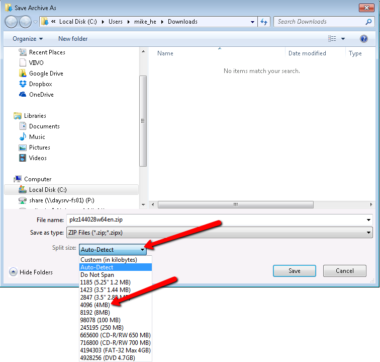You can change the default setting to always split your archives at a predetermined size
