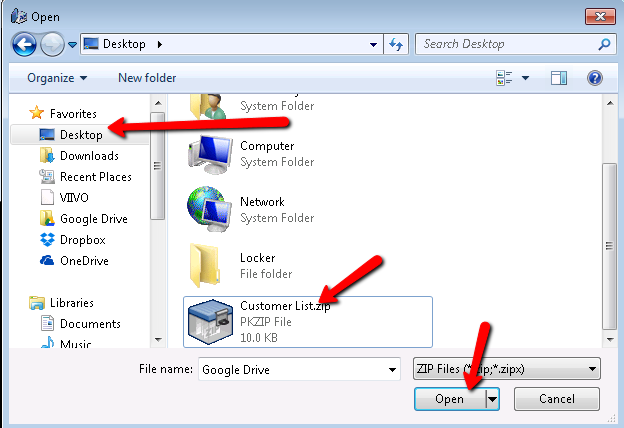 - Now, tell the ZIP Reader where your zip file is. Click on Desktop, click on the zip file you are working with and click Open. If the zip file is on a CD or DVD drive, scroll down and double click on that drive.