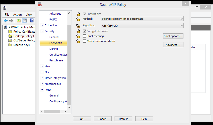 The policy manager has an interface that allows an administrator to set defaults, lock specific options such as encrypt email attachments, use FIPS mode and include a contingency key to any encrypted archive. This contingency key will allow the company to open any archive created with SecureZIP without needing to know the password used.